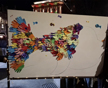 Participants decorate a hand-shaped scale using the provided materials and attach it to the artwork, gradually building up a layered surface made from many small contributions.